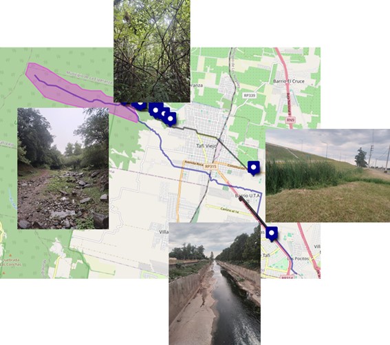 El espacio elegido para la intervención se encuentra en la parte baja del arroyo, cerca de su desembocadura, luego de haber recibido los vertidos de la citrícola COTA. Es un entorno profundamente modificado, atravesado por una ruta y rodeado de grandes barrios. A pesar de ello, persisten algunos espacios con totoras en la ribera, constantemente cortada.